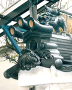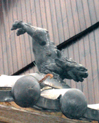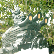 <屋根の上 二題> 下に鶴亀、上に阿吽の呼吸の狛犬 とにかく立派でした 少し無気味だけど、 これも狛犬ですかね