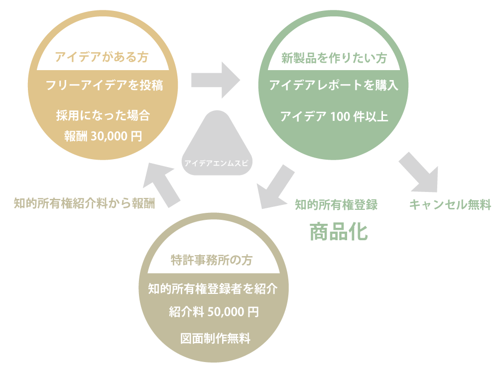 | アイデアエンムスビの概要 フリーアイデアを指定特許事務所で権利登録して新製品開発できるサービスです。 |