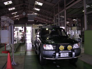 「ユーザー車検ですのでヨロシクお願いします ハアハア」と低姿勢で検査官にお願いし、さっそく灯火類からチェック… これはOK! 次はブレーキチェック…まずはサイドブレーキを引いたまま前進してタイヤが止まればOK! 次は前進しながら急ブレーキをかけてのブレーキチェック… これもOK! 今回は初めて中の装備をチェックされ、水回り、清水タンク、汚水タンク、コンロ、ベットなどを確認し、「では1番のラインへ入ってください」とのことでそのまま進入し(実はラインへ入るのは初めて)穴のあるところで止まって下回りをコツコツ叩いてチェック… この検査は初めてなのでキンチョウしながら検査官に「写真撮ってもいいですか?」と聞くと「あ〜どうぞ、どうぞ」で1枚パチリ!