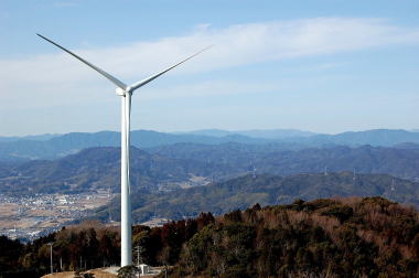 その左のこぶあたりには風力発電用の風車が沢山立っています。