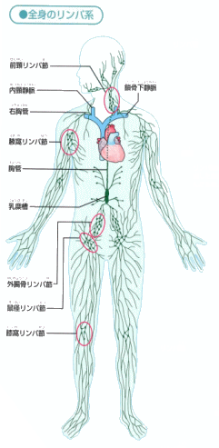 全身に網の目のように広がっている細いリンパ管は徐々に合流して太くなっていきます。 リンパ管が合流する要所にリンパ節があります。リンパ節は、首やわきの下、ひじ、膝、太もものつけ根などに集中しています。 |