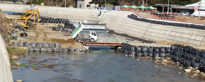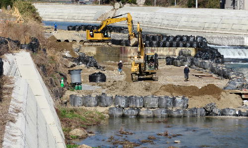 高田橋上流右岸・すでに完成した岸に通行路と仮橋を架けての作業