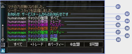 1対1の対話ができ、他の人からは会話が見られません。 “お友達の名前 メッセージ 上記のように入力します。お友達名とメッセージの間は半角スペースが必要です。 一度ウィスパーすると履歴が残り、続いて話しかける時は[Shift]+[“]で、再表示できます。 また、この状態でキーボードの↑↓を押すと履歴に残っているキャラクター名が表示されます。 ウィスパーは「濃いピンク」で表示されます。 |