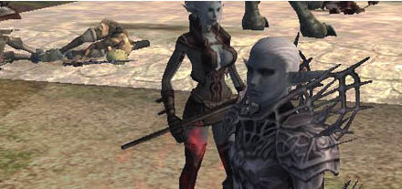 ダークエルフ 最初は水の神であり、現在は死の神となったシーレンを追従する種族です。 元々はエルフ族の一部族に過ぎませんでしたが、 ヒューマンとの戦いに敗れた後、ヒューマンに勝てる力を得るために、 グランカイン-シーレンの力である「黒魔法」を習い、 そのプロセスでエルフの“黒い鏡”としての道を歩むこととなりました。 外見はエルフとほぼ変わりありませんが、一般的に背が高く、 青褐色の肌に銀髪という特徴があります。 |